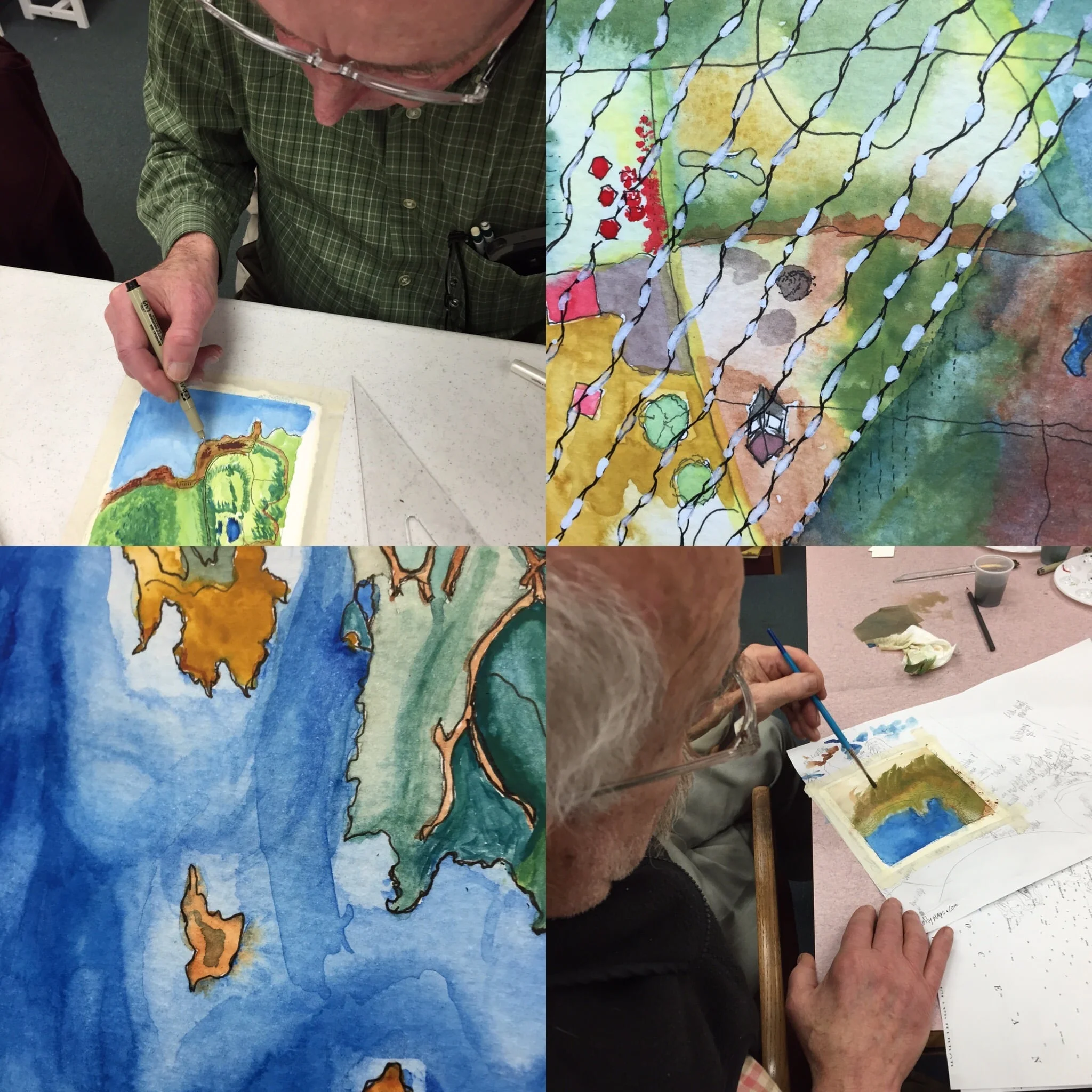 Some participants have lived in their town for 30 years and know every street and hilltop, and some just moved there. Some people feel they have ‘no artistic talent,’ while others come excited to use their abilities to make masterpieces. Everyone is welcome, and everyone will leave with an astonishingly exquisite map of a personally meaningful place. Interested adolescents and young adults welcome. I cap in-studio workshops at 8 participants, since interpersonal dialogue and instruction is vital to the process (and space to create!)